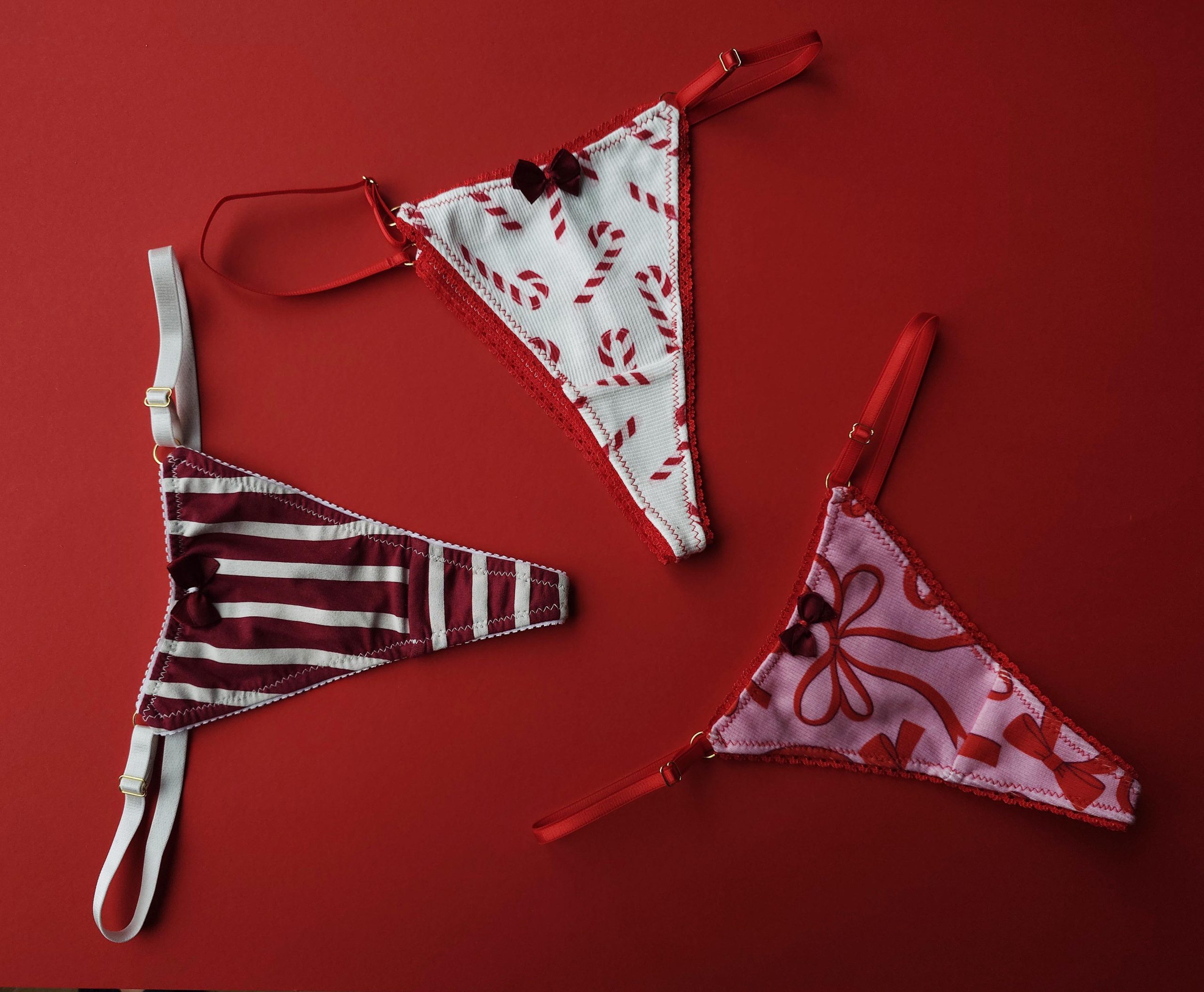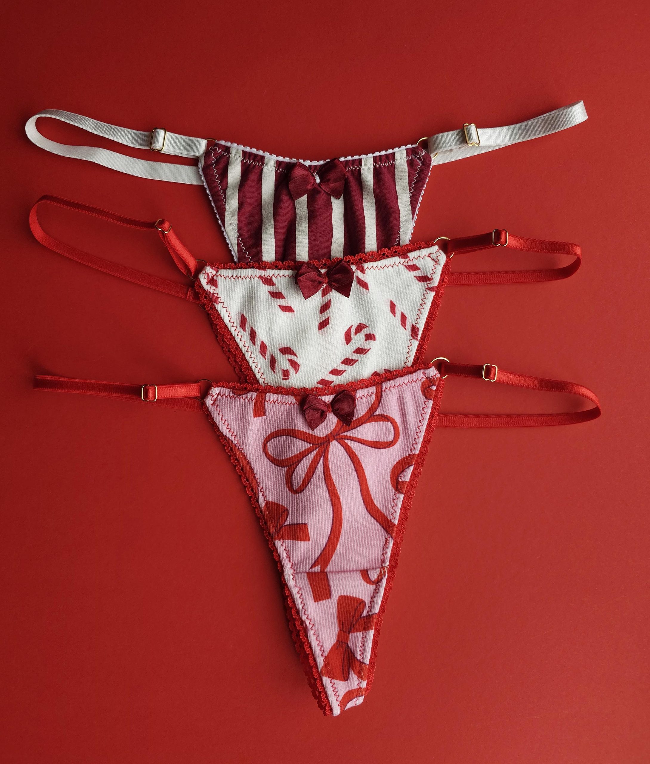 Trzy słodkie, świąteczne wzory – paski, kokardki i cukrowe laseczki – łączą wygodę z uroczym, świątecznym klimatem. Delikatne wykończenia i regulowane paski dbają o idealne dopasowanie, a ręczne wykonanie dodaje im wyjątkowego charakteru. Idealne na prezent dla kogoś lub dla siebie.
