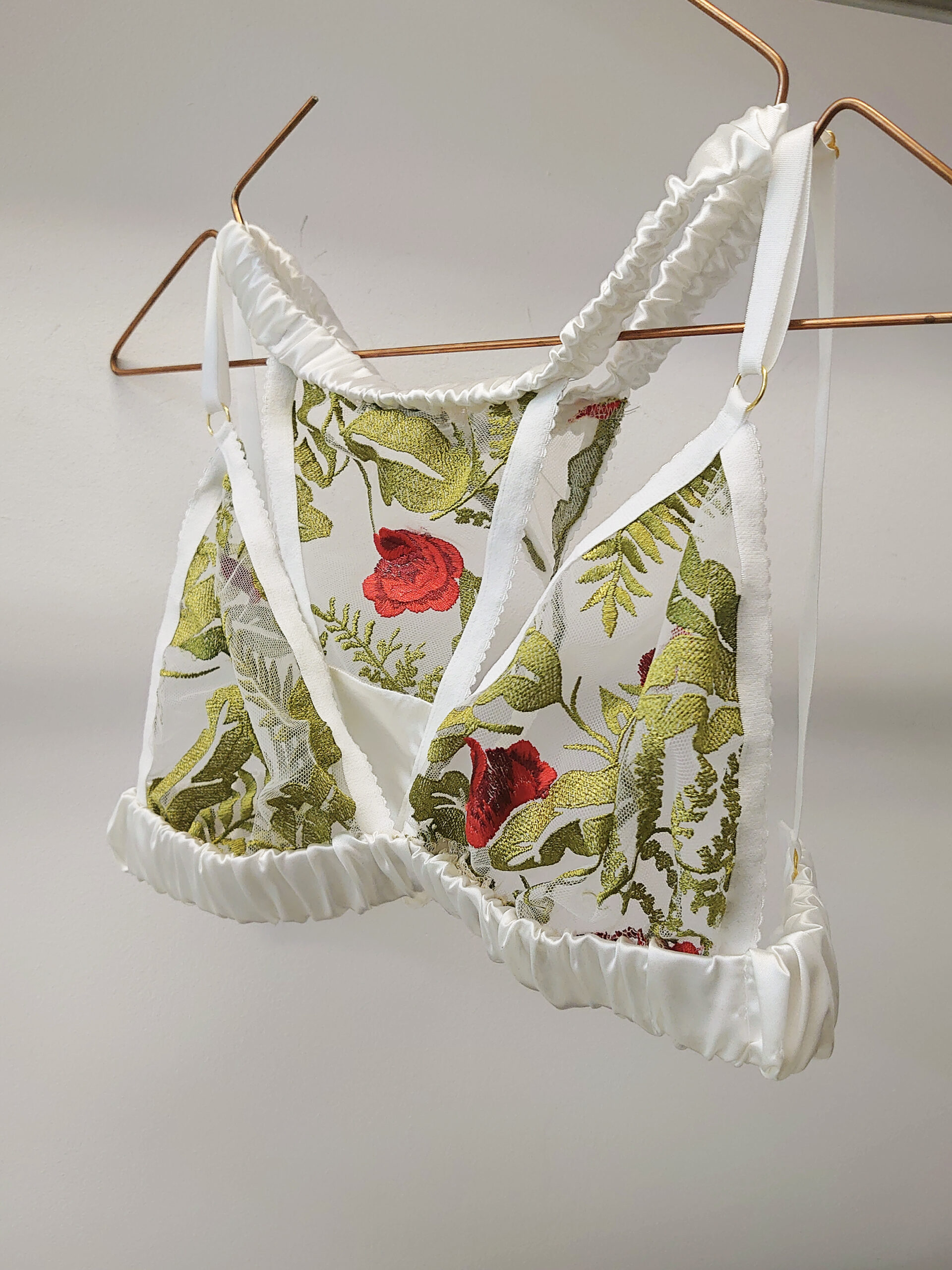 Biustonosz bez fiszbin wykonany z kwiecistego haftu, z szeroką gumą pod biustem, z regulacją ramiączek, zapinany z tyłu