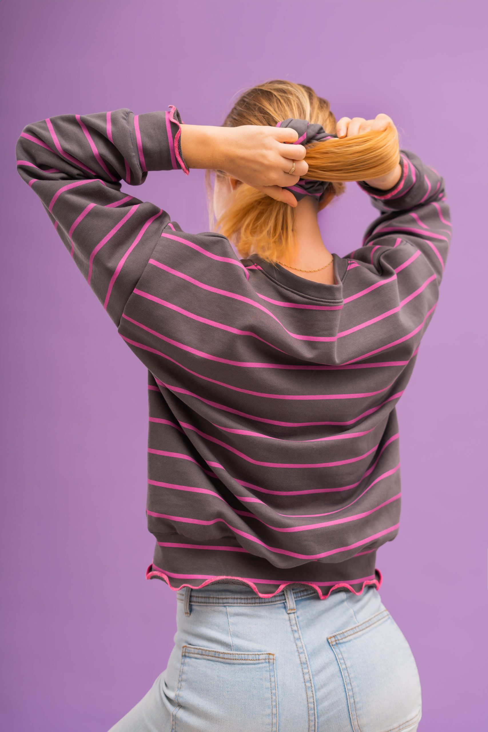 Raspberry Night to historia kontrastów – głębia grafitowej bazy spotyka się z energią malinowych pasków. Subtelne falbankowe wykończenia nadają bluzie lekkości i kobiecego charakteru, sprawiając, że codzienny strój zyskuje wyjątkowy akcent.
