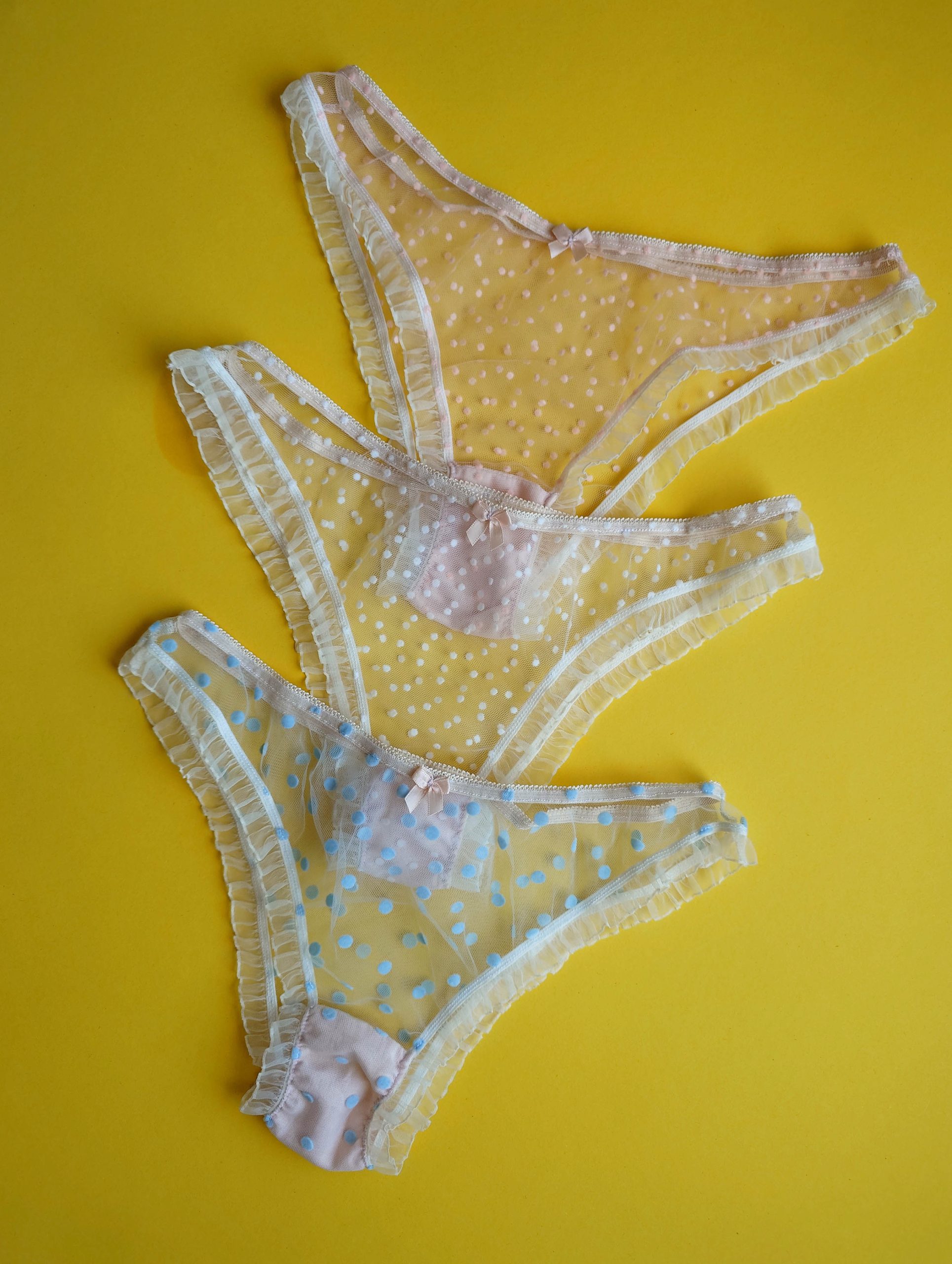 Unikatowe figi wykonane w rodzinnej pracowni krawieckiej, tworzone specjalnie na zamówienie. Każda para powstaje z delikatnego tiulu w groszki, dostępnego w trzech kolorach – róż, ecru i błękit.